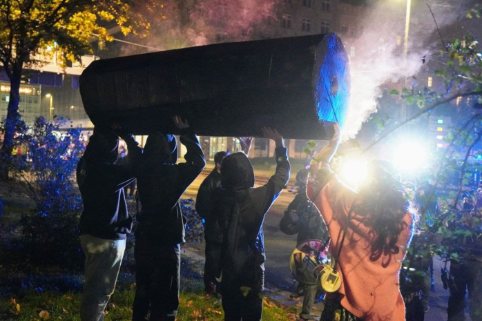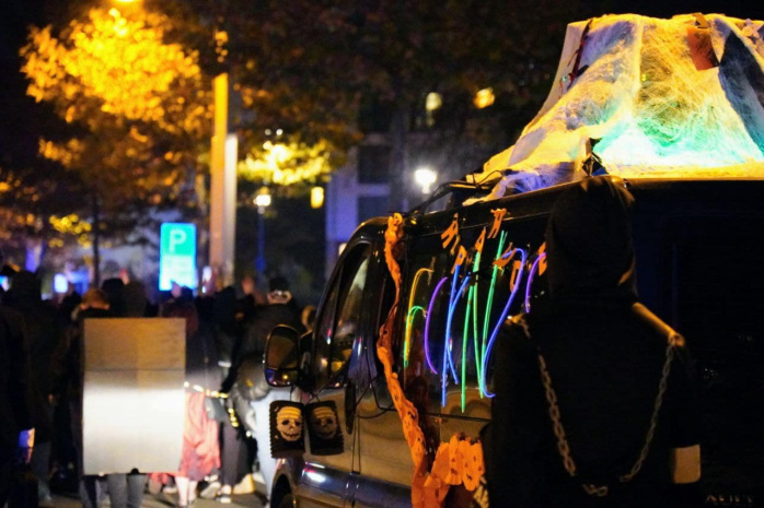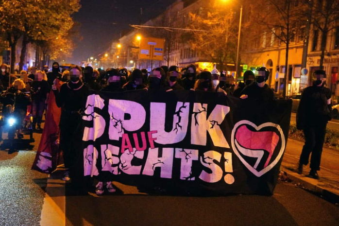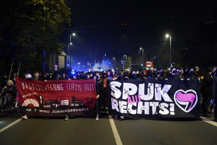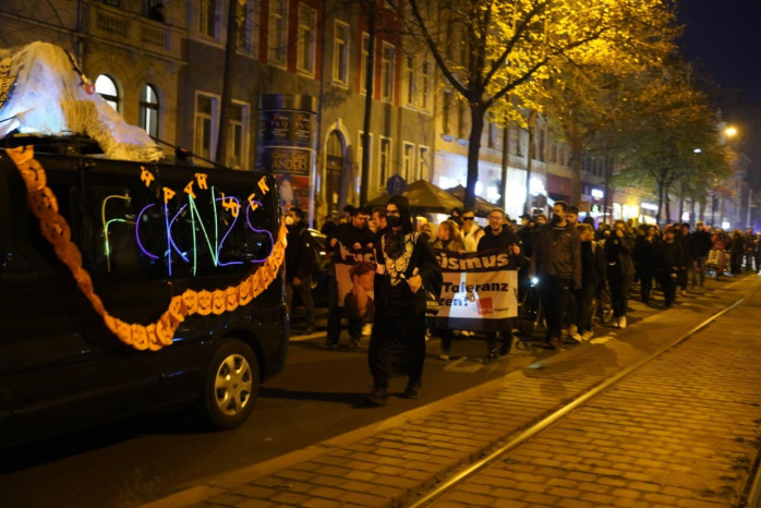 „Welcome to Hell“ und „den Faschisten werden wir das Fürchten lernen“, hieß es für den heutigen Montag, 31. Oktober stilecht bereits im Aufruf von „Leipzig nimmt Platz“ (LnP). Nun sind seit 18 Uhr um die 500 bis 600 mehr oder minder verkleidete Antifaschistinnen auf der Straße, streichen durchs Dunkel einer „Halloween-Nacht“, um die Querdenker zu erschrecken. Unter ihnen ausgerechnet Christian Lindner, welcher als gruseligstes Schreckgespenst alle anderen im Kostümwettbewerb schlagen konnte.