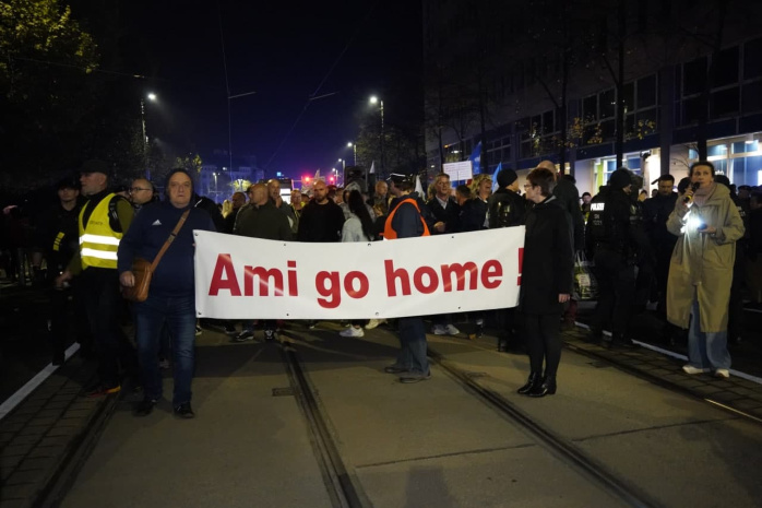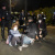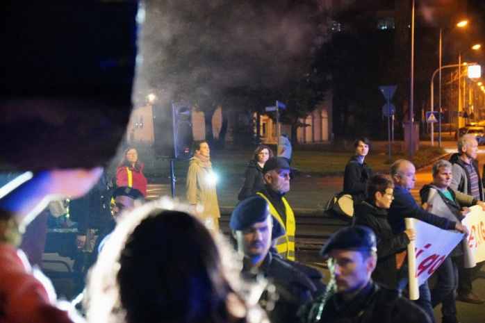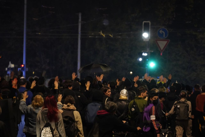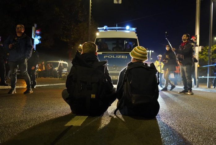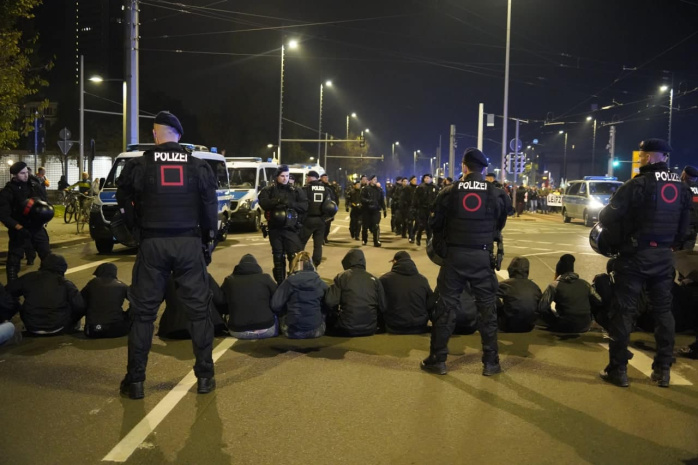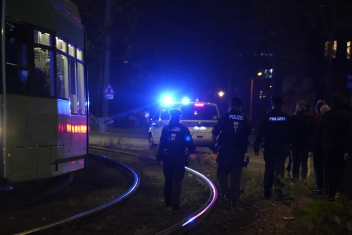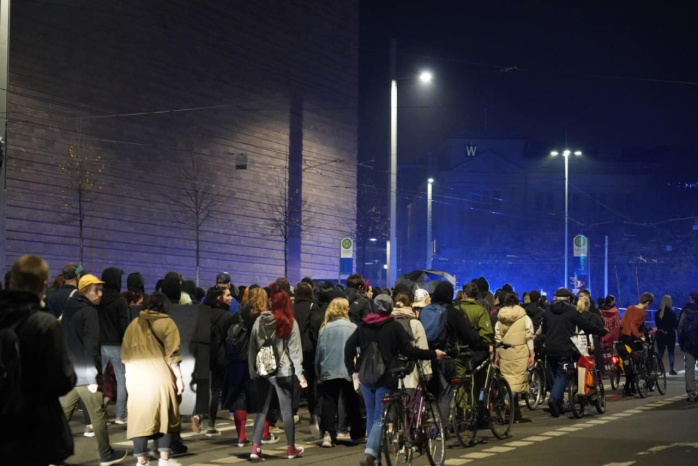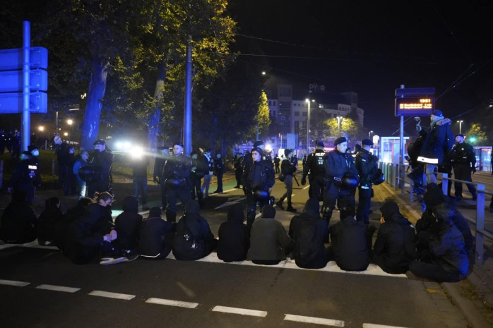 Gegen 19:45 Uhr bildete sich nun eine erste Blockadeaktion. Auf der Höhe der Haltestelle Wilhelm-Leuschner-Platz setzten sich zunächst zwei Personen auf die Straße, später kam eine Gruppe um vier Personen dazu, darunter die Linken-Landtagsabgeordnete Juliane Nagel.
