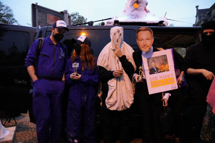 Da half auch die Verkleidung als Querdenker-Anmelderin Annette H., welche erst einmal ihre Aura herrichten musste, wortloses Gespenst oder lachende Polizeibeamtin nichts: als die Ausrufung des Platz 1 beim „Leipzig nimmt Platz“-Auftakt an der Karl-Liebknecht-Straße erfolgte, war Christian Lindner die Verkleidung mit dem größten Abschreckungsfaktor.