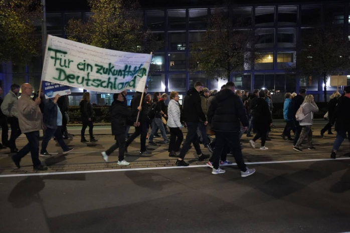 Beim Blick kurz nach 19 Uhr über den Augustusplatz bekam Anmelderin Annette H. ein wenig Bammel und mutmaßte, dass heute wegen der Zeitumstellung weniger Teilnehmerinnen bei ihrem verschwörungsideologischen Gang um den Ring teilnehmen könnten.