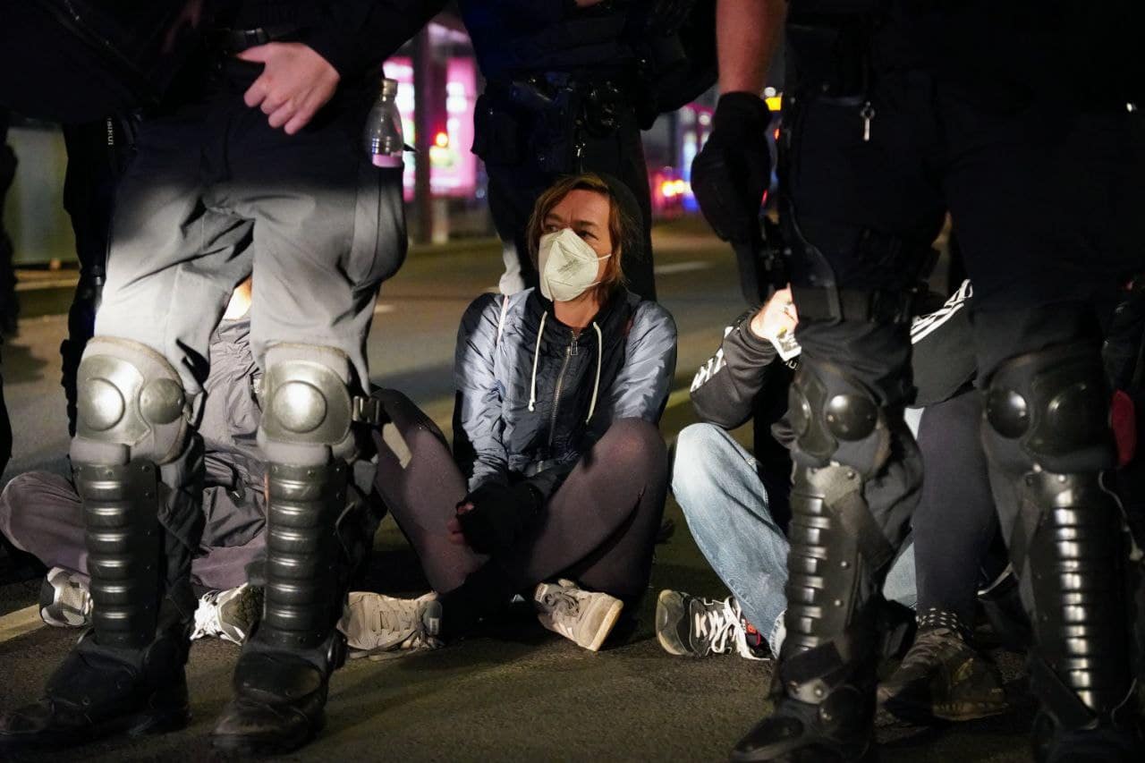 Der Demonstrationszug der „Querdenker“ steht erst einmal, die Polizei hat die Blockade umstellt. In der vergangenen Woche wurde in einer solchen Situation der Zug meist an den sitzenden Personen vorbeigeleitet.