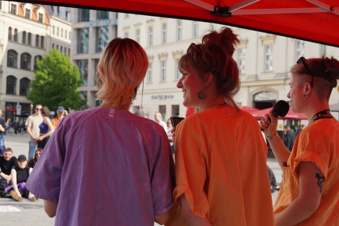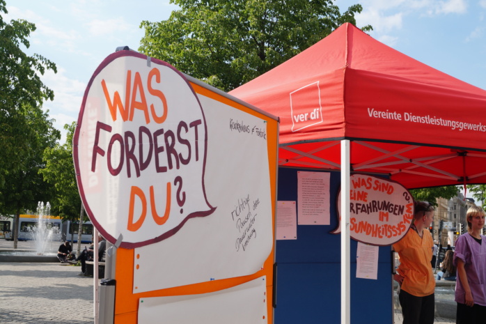 „Das Problem der Pflege, ist nicht, dass nicht genug ausgebildet wird. Das Problem ist, dass zu viele Menschen diesen Beruf gefrustet wieder verlassen oder ausgebrannt sind. 25 Prozent aller examinierten Pflegekräfte erwägen den Berufsausstieg“, so Kristian Fink, ver.di-Jugendsekretär Leipzig/Nordsachen und Gesundheits- und Krankenpfleger, in seiner Rede.
