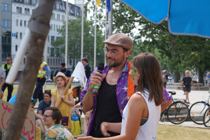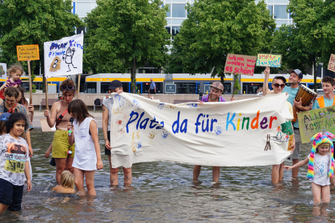 Bei der Zwischenkundgebung auf dem Willy-Brandt-Platz forderte ein*e (nicht-erwachsene) Redner*in: „Hier ist überall Platz für Spielplätze. Auf diesem Platz zum Beispiel. Aber was macht die Stadt? Die machen nur Wiesen hin. Um zu zeigen, wie reich sie sind, mit den ganzen Blumen und so.“