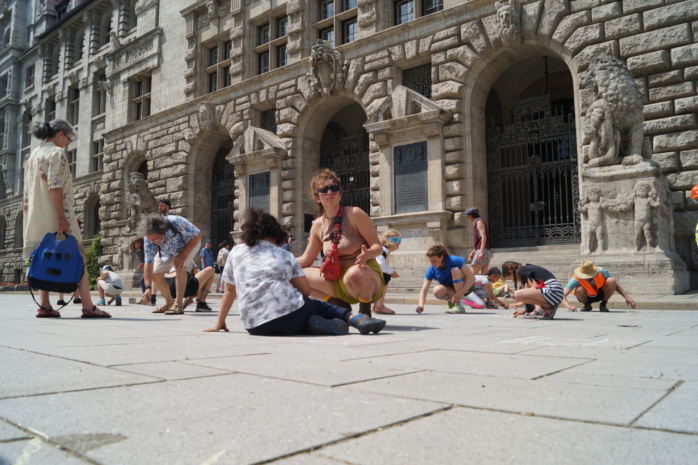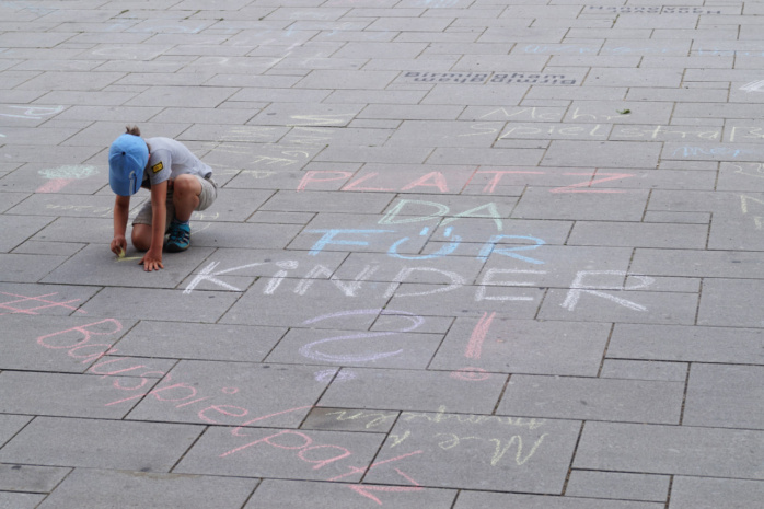 Um 14 Uhr startete die Kundgebung vor dem Neuen Rathaus. „Dass Kinder mehr ihre Meinung sagen können“, „Mehr Rechte für Kinder“, „Weniger Hausaufgaben“, „Mehr Bauspielplätze“, „Weniger Müll“ und „Weniger Autos auf dem Schulweg“ lauteten einige der Forderungen, die vor allem die Kinder in kurzen, spontanen Redebeiträgen verkündeten. Die Forderung nach „Mehr Polizei, um Diebe zu fassen“ wird bei einigen Linkspolitischen (Erwachsenen) wahrscheinlich Unwohlsein ausgelöst haben. Die Botschaften wurden vor dem Neuen Rathaus mit Kreide verewigt. Eine Liste der Forderungen soll dem Stadtrat vor der nächsten Sitzung überreicht werden.