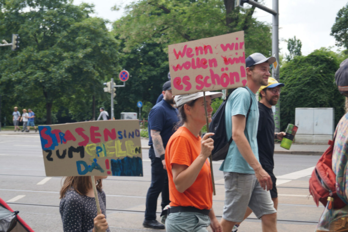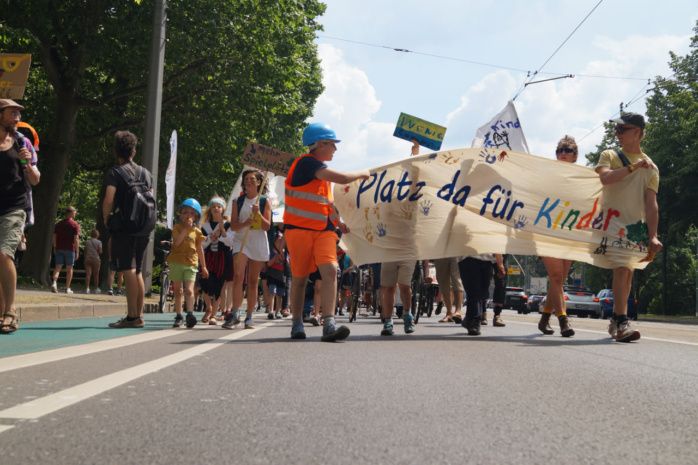 „Wir machen diese Demo, weil die Kinder sonst nicht gehört werden“, so einer der erwachsenen Veranstalter. „Die Kinder müssen jeden Tag zur Schule, zwischen den Autos lang. Und am Nachmittag hat man dann keine Zeit zum Spielen und auch keinen Platz. Kinder werden ja irgendwann auch groß und dann denken sie, dass die Welt schlecht ist. Und das wäre natürlich doof. Deshalb wollen wir bessere Bedingungen für die Kinder.“