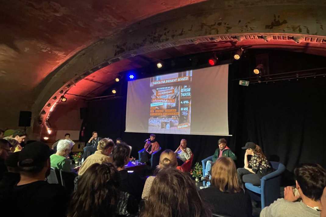 Es ist ein Thema, dass nicht nur die Betreiber*innen der Ladenprojekte umtreibt, sondern auch die Anwohnenden beschäftigt, die der Veränderung ihres Kiezes mit Sorge begegnen. Um dem großen Interesse nachzukommen, wurden kurz vor Veranstaltungsbeginn zahlreiche zusätzliche Stühle in jede noch freie Ecke des vollbesetzten Saals im Ost-Passage Theater geschoben.