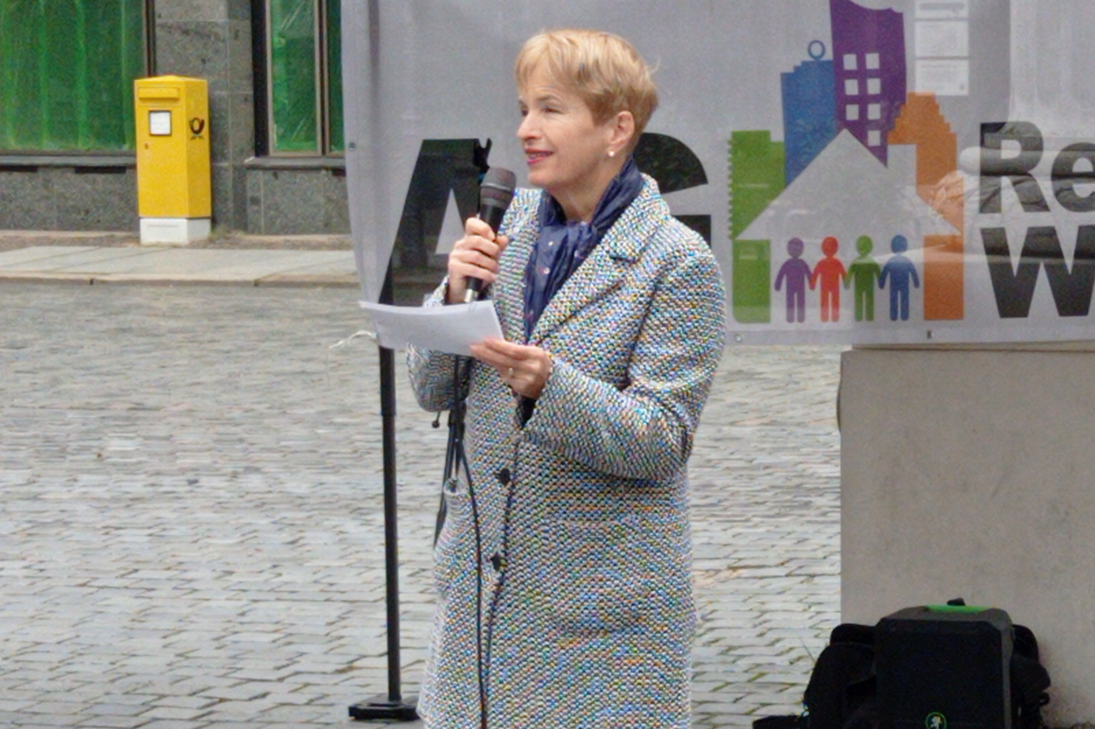Susanne Ziebula vom Leipziger Jugendwohnen bestätigte die Probleme der Wohnraumversorgung von jungen Menschen: „Wir begleiten junge Menschen zwischen 18 und 25 Jahren in ihren ersten eigenen Wohnraum. Wir sind ja heute hier zum Tag der Wohnungslosen auf dem Nikolaikirchhof und ich stehe hier tatsächlich für die jungen Leute, die sich zu großer Zahl bei unserem Projekt für eine Wohnung bewerben.