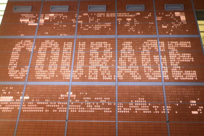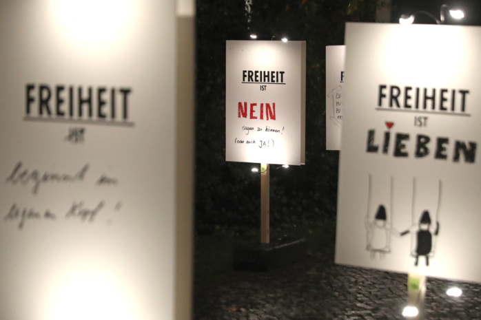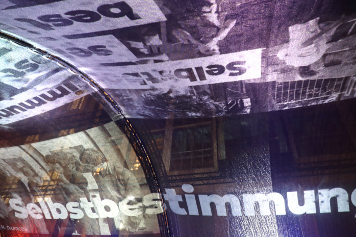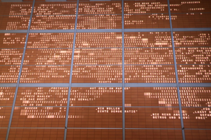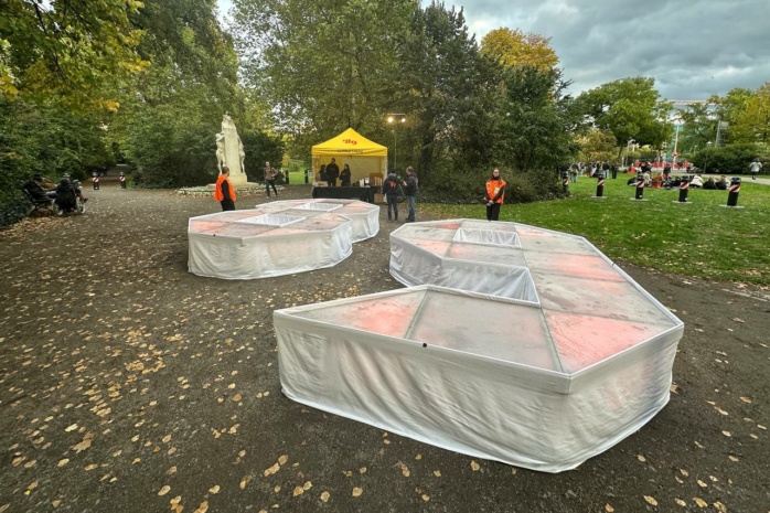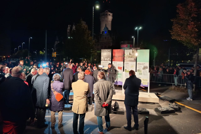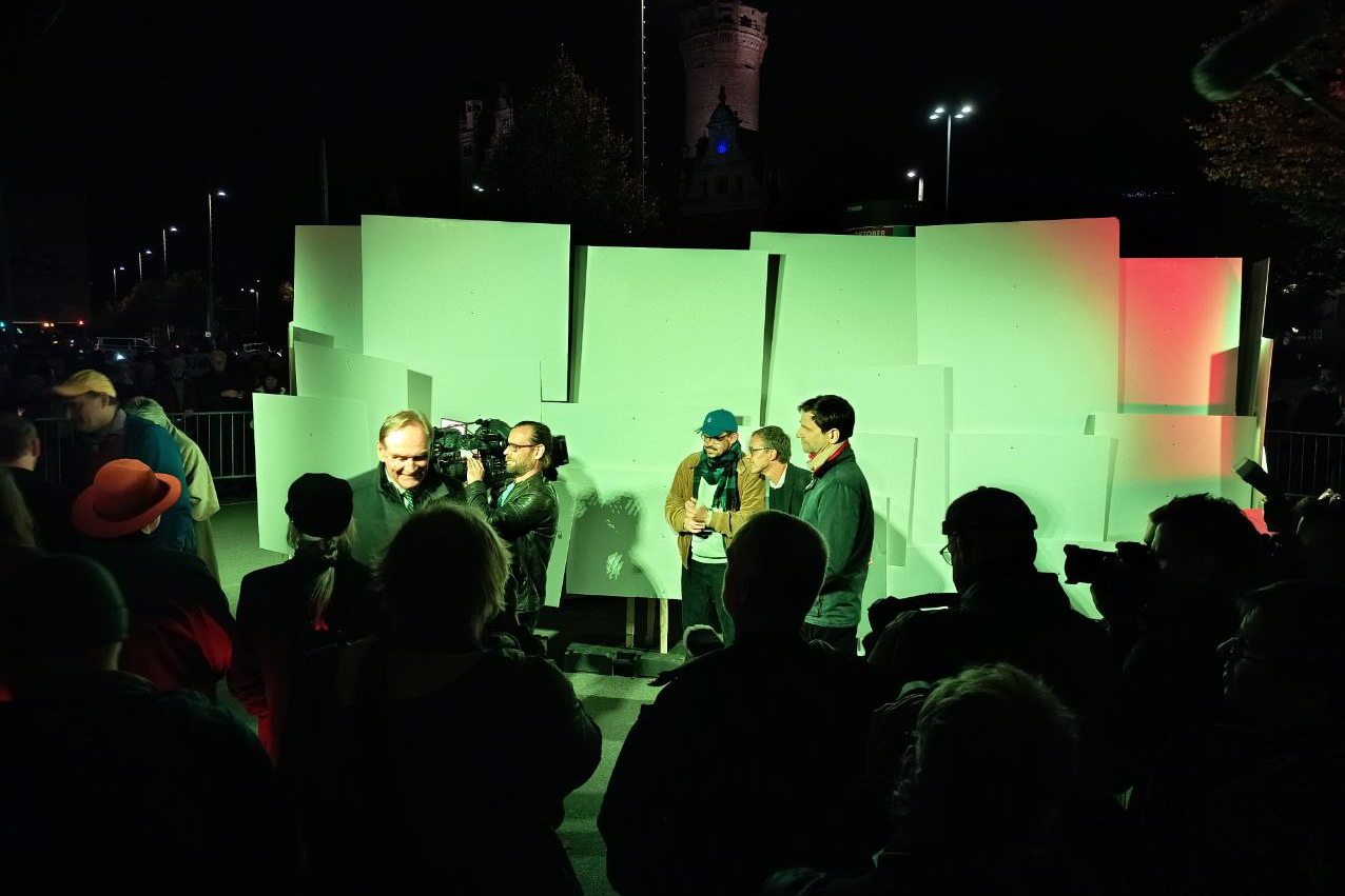 Langsam verlegt sich das Geschehen zum provisorischen Grundstein des Freiheits- und Einheitsdenkmals. Hier wird ein Kunstwerk enthüllt, das bis zur Einweihung des eigentlichen Denkmals, derzeit geplant für 2029, den Platz hütet.