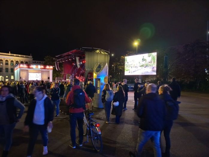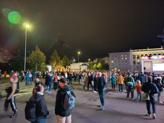 Inzwischen füllt sich auch der Wilhelm-Leuschner-Platz, wo neben der Grundsteinlegung für das Freiheits- und Einheitsdenkmal ein buntes (Bühnen)Programm aus Gesprächen, Tanz-Performance und Chor auf dem Plan steht. Weil die Veranstaltung in der Nikolaikirche nicht ganz nach Zeitplan lief, verzögert sich auch der Beginn hier auf nach 20:00 Uhr, so eine Durchsage vor Ort.