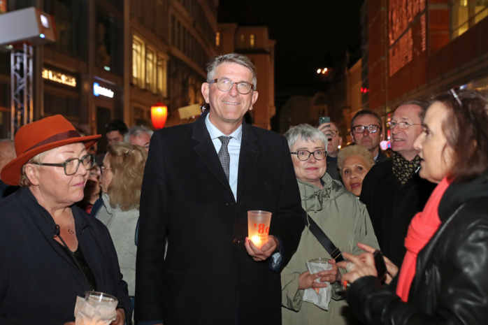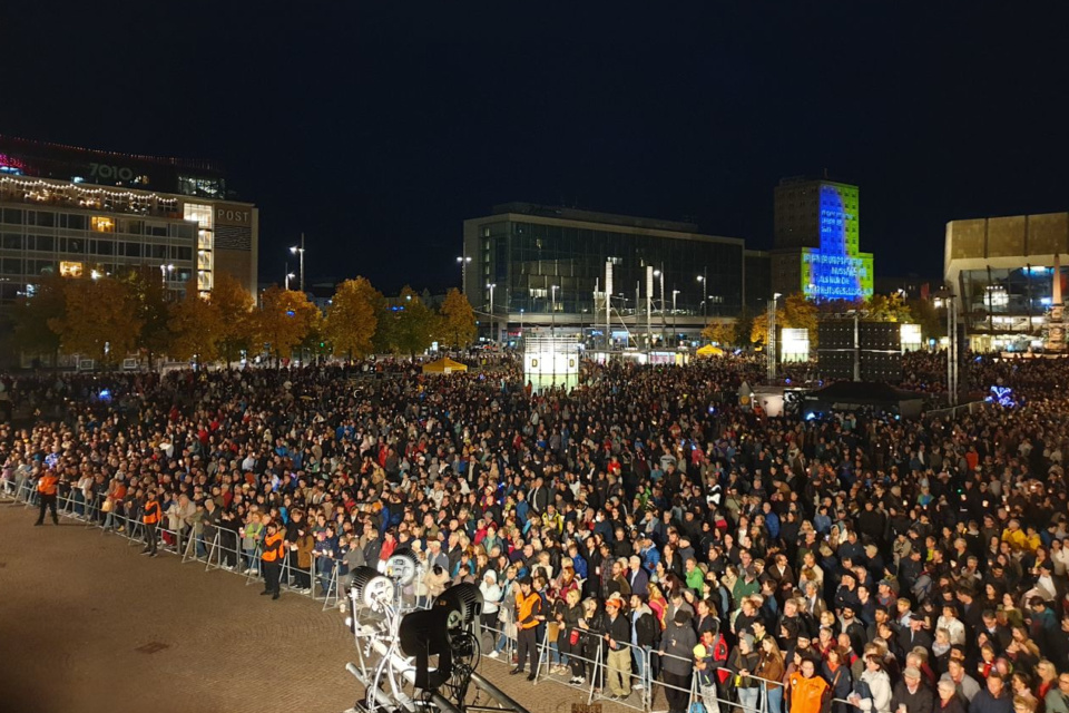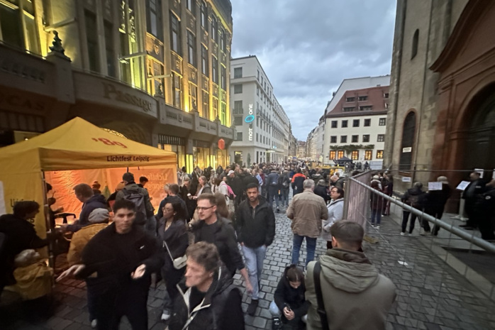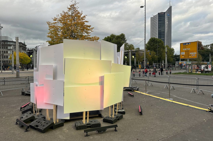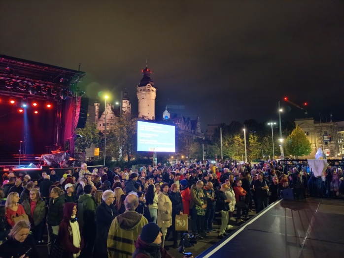 In der Nikolaikirche geht die Veranstaltung in diesen Minuten mit musikalischem Ausklang ihrem Ende entgegen. Um 20:00 Uhr soll die Enthüllung des „Grundsteins“ auf dem Wilhelm-Leuschner-Platz stattfinden, bis 22:00 Uhr kann zudem der Lichtweg mit den Lichtkunstprojekten begangen werden.