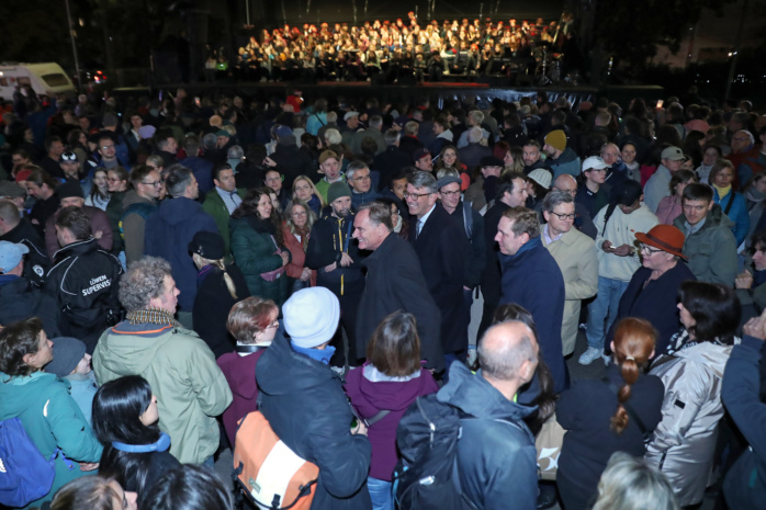 Der Höhepunkt auf dem Wilhelm-Leuschner-Platz ist vorbei, die Party klingt gemütlich mit letzten Chorliedern aus. Im Hinblick auf die Grundsteinlegung spricht Kuturstaatsminister Weimer von einem „Denkmal der Ermutigung.“ Das eigentliche Freiheits- und Einheitsdenkmal soll später in Form von Skulpturen in einer parkartigen Anlage auf dem Wilhelm-Leuschner-Platz entstehen.
