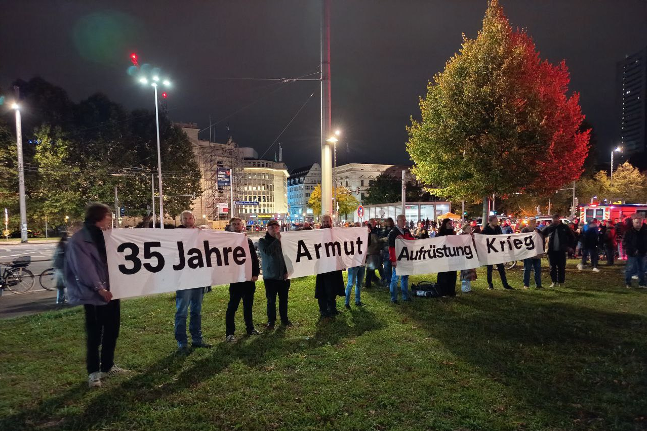 Auch das ist Demokratie, könnte man sagen: Eine kleine Gruppe protestiert am Rand der Veranstaltung auf dem Wilhelm-Leuschner-Platz, spricht von 35 Jahren Aufrüstung, Armut und Krieg. Die DDR als sozialistischer Staat und Versuch einer alternativen Gesellschaftsorganisation sei mit ihren Errungenschaften zerschlagen worden, heißt es in einem Flyer. Mit der Einheit könne man nichts anfangen.