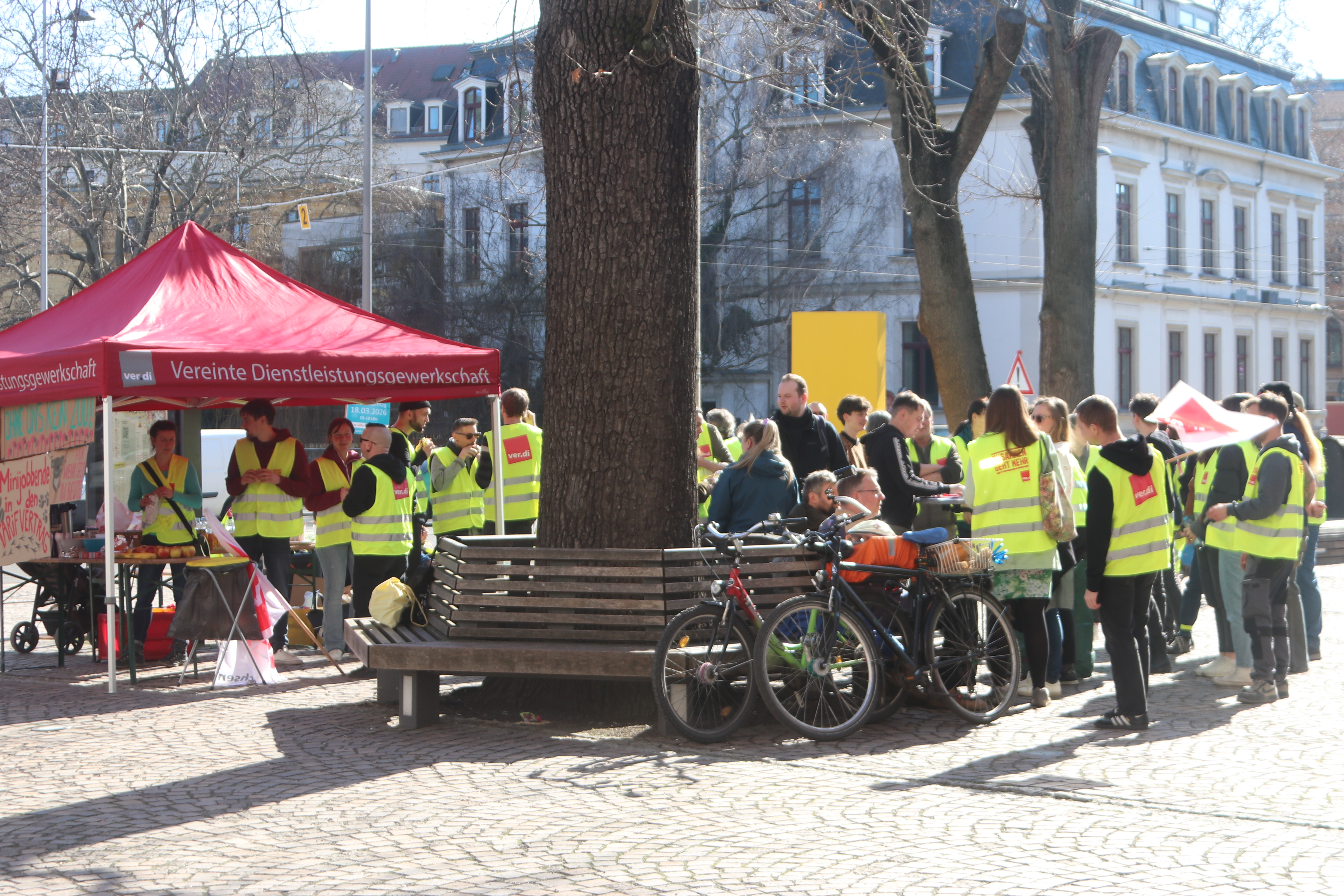 Die Gewerkschaft ver.di verhandelt für die Beschäftigten im Zoo Leipzig gerade den Haustarifvertrag mit dem Arbeitgeber. Momentan sieht es nicht nach einem Streik von „Elefant, Tiger & Co.“ aus, dafür rief ver.di am Tag vor der nächsten Verhandlungsrunde zu einer aktiven Mittagspause auf. Zwischen 12.20 und 12.50 Uhr trafen sich rund 50 Beschäftigte während ihrer offiziellen Mittagspause vor dem Eingang zum Zoo und machten auf ihre Forderungen aufmerksam.