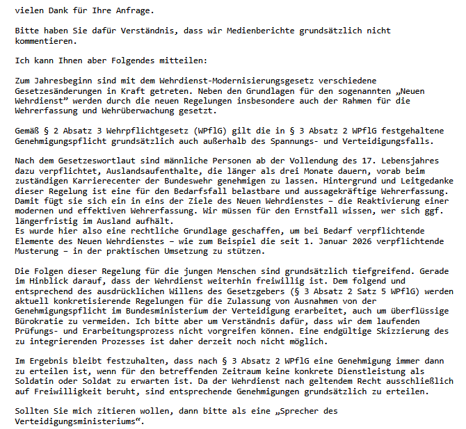 Was ist geschehen? Irgendjemand hat mitbekommen, dass der § 3 (2) im Wehrpflichtgesetz (WPflG) der Bundesrepublik Deutschland, in der Fassung vom 22.12.2025, folgenden Passus enthält: „Männliche Personen haben nach Vollendung des 17. Lebensjahres eine Genehmigung des zuständigen Karrierecenters der Bundeswehr einzuholen, wenn sie die Bundesrepublik Deutschland länger als drei Monate verlassen wollen, ohne dass die Voraussetzungen des § 1 Absatz 2 bereits vorliegen. Das Gleiche gilt, wenn sie über einen genehmigten Zeitraum hinaus außerhalb der Bundesrepublik Deutschland verbleiben wollen oder einen nicht genehmigungspflichtigen Aufenthalt außerhalb der Bundesrepublik Deutschland über drei Monate ausdehnen wollen.“