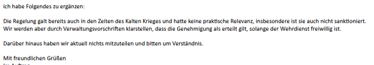 Frage 2 ist die wichtigere: Für wen gilt § 3 (2) eigentlich? Dazu eine kleine Ableitung: Die Frage haben wir dem Bundesministerium für Verteidigung gestellt. Eine Antwort haben wir nicht erhalten.