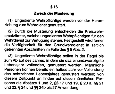 Im alten Paragrafen 16 (3) WPflG war der allgemeine Zeitpunkt der Musterung definiert als „bis zum Ablauf des Jahres, in dem sie das einundzwanzigste Lebensjahr vollenden.“