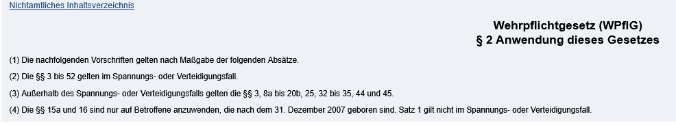 Frage 1: Warum gibt es Paragraf 2 Absatz 2 im WPflG, der die Gültigkeit des Paragrafen 3 mit folgenden Worten regelt: „Die §§ 3 bis 52 gelten im Spannungs- oder Verteidigungsfall“, wenn dieser Absatz im folgenden mit „Außerhalb des Spannungs- oder Verteidigungsfalls gelten die §§ 3, 8a bis 20b, 25, 32 bis 35, 44 und 45“, betreffs § 3, wieder aufgehoben wird?