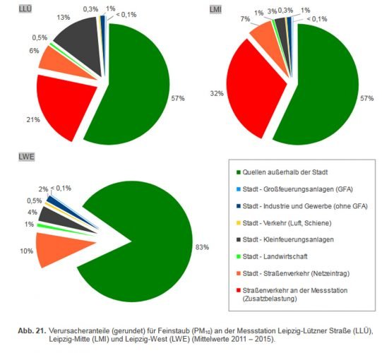„Der PLZ-Bereich 04177 rangiert stadtweit an zweiter Stelle was die Anzahl an Kohlefeuerungen anbelangt“, so der Bricht zum Luftreinhalteplan. „Da sich die im Bestand vorhandenen Anlagen auf ein vergleichsweise kleines PLZ-Gebiet verteilen, ist ein erhöhter Einfluss dieser Anlagen auf die Luftqualität im Gebiet selbst bzw. daran angrenzenden Gebieten sehr wahrscheinlich. Gleichwohl ergaben die im Zeitraum von 03/2015-03/2016 durchgeführten Analysen der an LLÜ beprobten PM10-Inhaltsstoffe Selen, Kalium und Mangan, als Marker für Holz- und Kohleheizung, keine dies bekräftigenden Anhaltspunkte. Einzig die an LLÜ registrierten PAK-Konzentrationen liegen geringfügig höher als an den sonstigen städtischen Luftmessstationen in Sachsen, was ein Indiz für einen erhöhten Anteil Festbrennstofffeuerung sein kann.“
