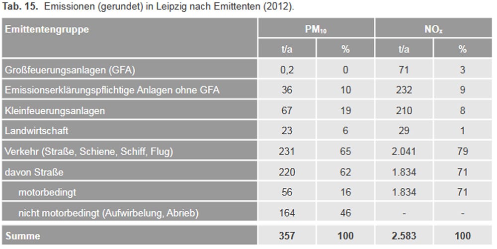 Und ganz ähnlich ist das Bild beim ebenfalls krebserregenden Stickstoffdioxid (NO2), von dem in Leipzig im Jahr 2.583 Tonnen emittiert werden – und davon 2.041 allein im Verkehr. Der Straßenverkehr hat hier einen Anteil von 1.834 Tonnen – und zwar alles „motorbedingt“, wie es im Bericht heißt. Deshalb stehen nämlich die Dieselfahrzeuge nun seit einigen Jahren im Zentrum der Debatte – sie sind es vor allem, die in der Stadt Leipzig für NO2-Emissionen sorgen.