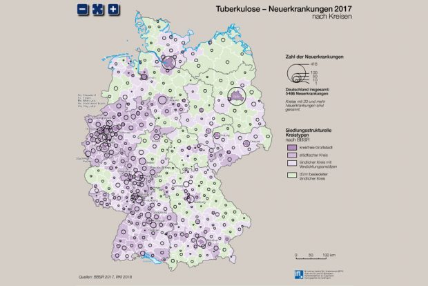 Wie die Geografen Martina und Holger Scharlach im jüngsten Beitrag des IfL-Webangebots Nationalatlas aktuell berichten, ist in Deutschland das Risiko, an Tuberkulose (TB) zu erkranken, in den Städten um den Faktor 1,7 höher als in den dünn besiedelten ländlichen Räumen. Mit 418 Erkrankungen wurden 2017 in Berlin die meisten neuen TB-Fälle registriert, gefolgt von Hamburg (234), München (123), Köln (105) und Frankfurt am Main (99).
