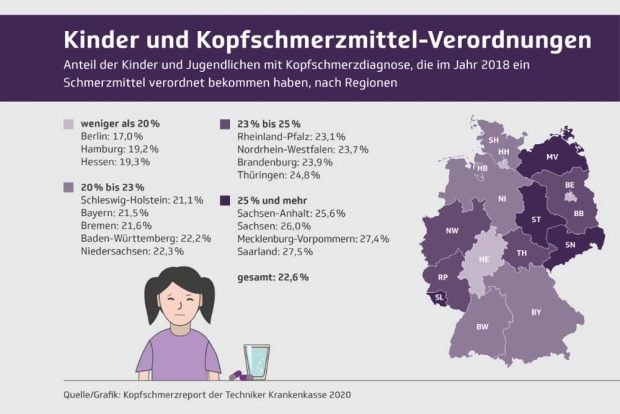 In Sachsen erhält jedes vierte Kind unter 19 Jahren mit der Diagnose Kopfschmerz Arzneimittel verordnet. Mit 26 Prozent erreicht Sachsen damit nach Saarland (27,5 Prozent) und Mecklenburg-Vorpommern (27,4 Prozent) den dritthöchsten Wert im Vergleich aller Bundesländer. Den geringsten Anteil verzeichnet Berlin mit 17 Prozent. Zu diesem Ergebnis kommt der Kopfschmerzreport, den die Techniker Krankenkasse (TK) gestern vorgestellt hat.