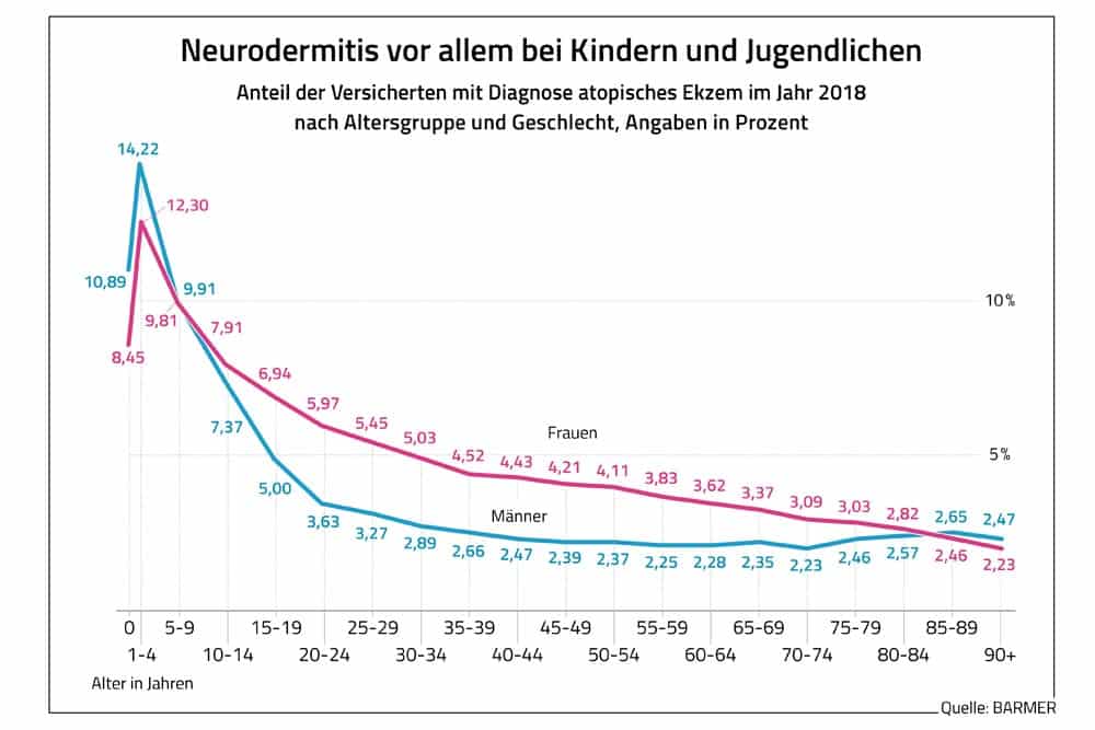 Allem voran waren Kleinkinder und hier besonders Jungen im Alter bis fünf Jahren betroffen. So stellten Ärzte bei 14,22 Prozent der ein- bis fünfjährigen Jungen eine Neurodermitis fest. Dies entsprach mehr als 13.600 sächsischen Jungen. Bei den Mädchen derselben Altersgruppe lag der Anteil mit 12,3 Prozent etwas niedriger. Etwa 11.200 Mädchen waren betroffen.