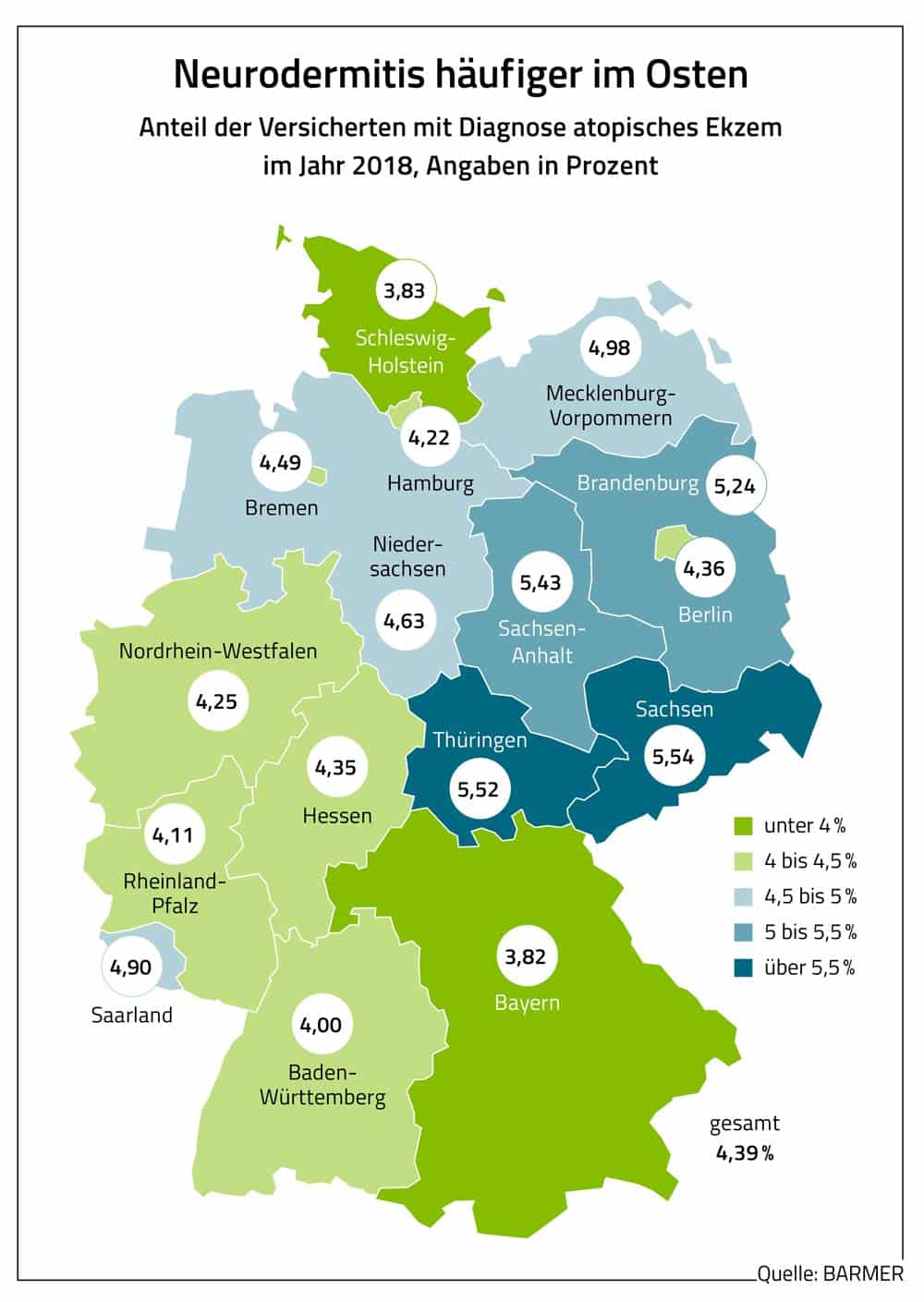 Nach der Barmer-Analyse tritt Neurodermitis allem voran in den ostdeutschen Bundesländern auf. Im Jahr 2018 wurde die Krankheit bei 5,54 Prozent der Bevölkerung von Sachsen diagnostiziert, gefolgt von Thüringen, Sachsen-Anhalt und Brandenburg. Die niedrigsten Raten gab es in Bayern mit 3,82 Prozent und Schleswig-Holstein mit 3,83 Prozent. Niedersachsen mit 4,63 und Bremen mit 4,49 Prozent liegen im Mittelfeld.