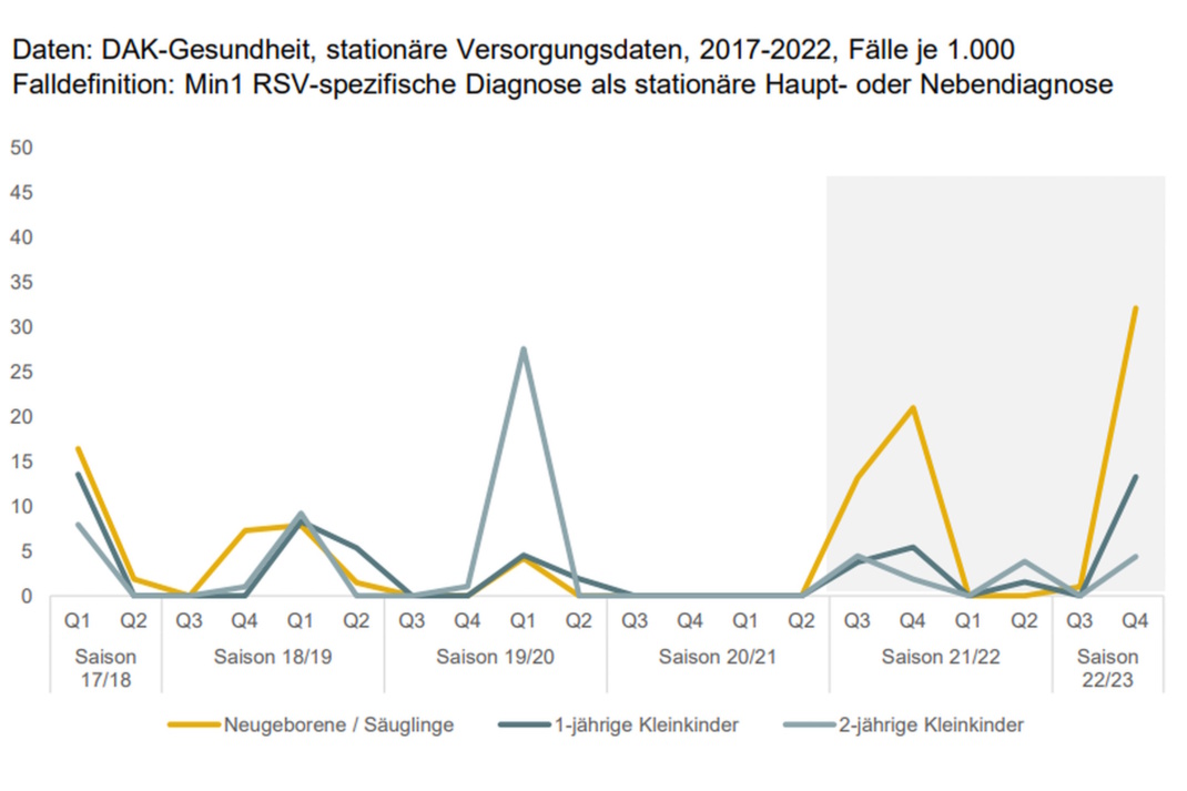 Als erste Krankenkasse hat die DAK-Gesundheit die Krankenhausbehandlungen von Kindern und Jugendlichen in Sachsen mit Hinblick auf RSV-Infektionen bis Ende 2022 untersucht. Danach haben sich die Klinikbehandlungen von Neugeborenen und Säuglingen mit einer RSV-Infektion im Vergleich der vierten Quartale 2022 und 2018 vervierfacht – im Bundesschnitt haben sich die Zahlen sogar verfünffacht.