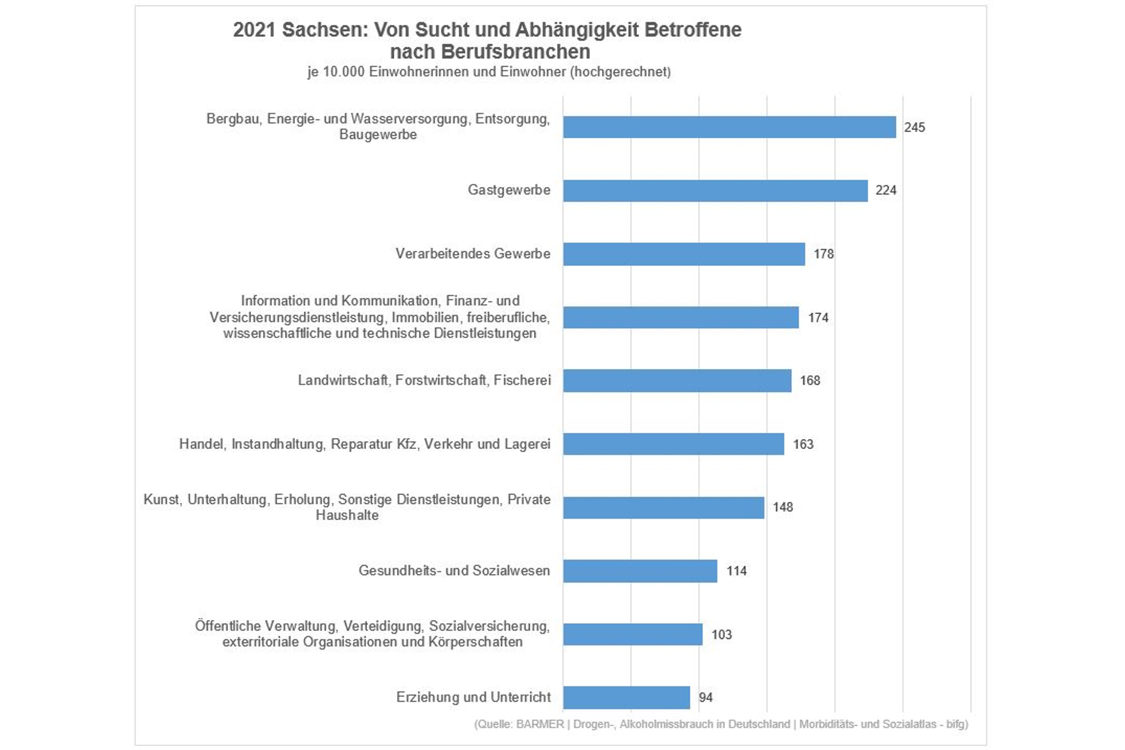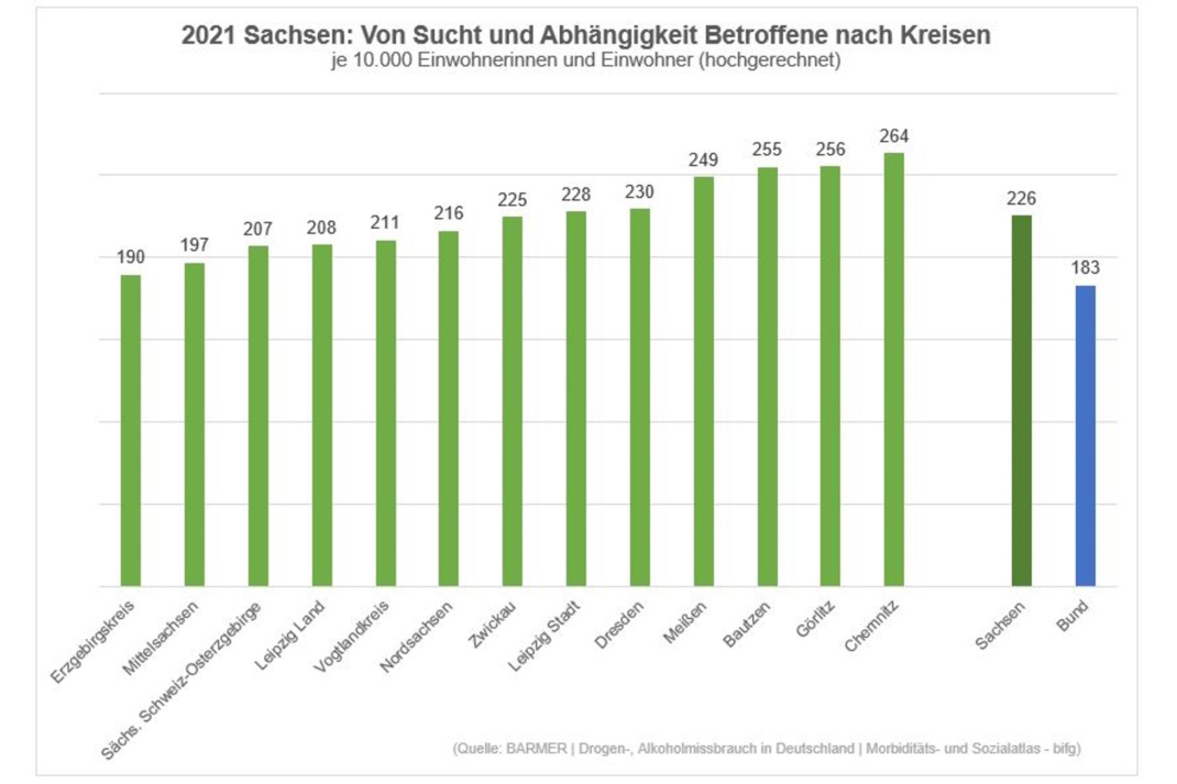 „Die Gefahr einer Suchterkrankung ist für sächsische Beschäftigte im Bau- und Gastgewerbe besonders hoch“, stellt die BARMER in Auswertung der Zahlen fest. „Demnach lag die Rate für eine Suchterkrankung im Zusammenhang mit Alkohol, Drogen oder Medikamenten bei den Beschäftigten des Bereichs Bergbau, Energie- und Wasserversorgung, Entsorgung und Baugewerbe im Jahr 2021 bei 245 Fällen pro 10.000 Einwohnerinnen und Einwohner (Bund: 168 Fälle).