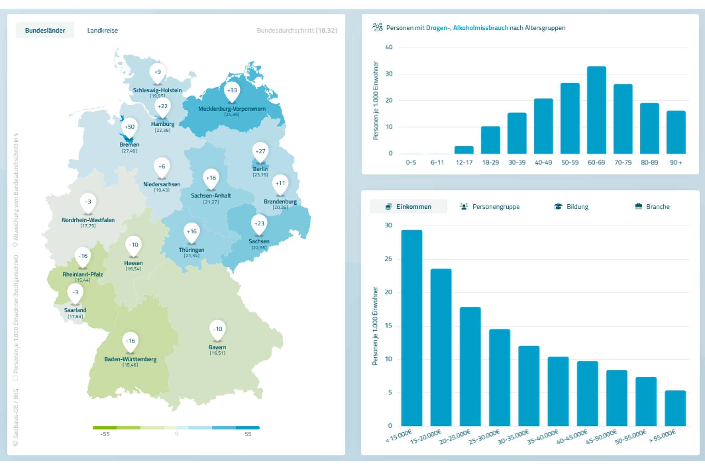 Aber auch der Deutschlandkarte zeigt, dass die Suchtproblematik eng mit der ökonomischen Entwicklung gekoppelt ist – mit deutlich höheren Betroffenenzahlen in Ostdeutschland und deutlich niedrigeren Zahlen in Süddeutschland.