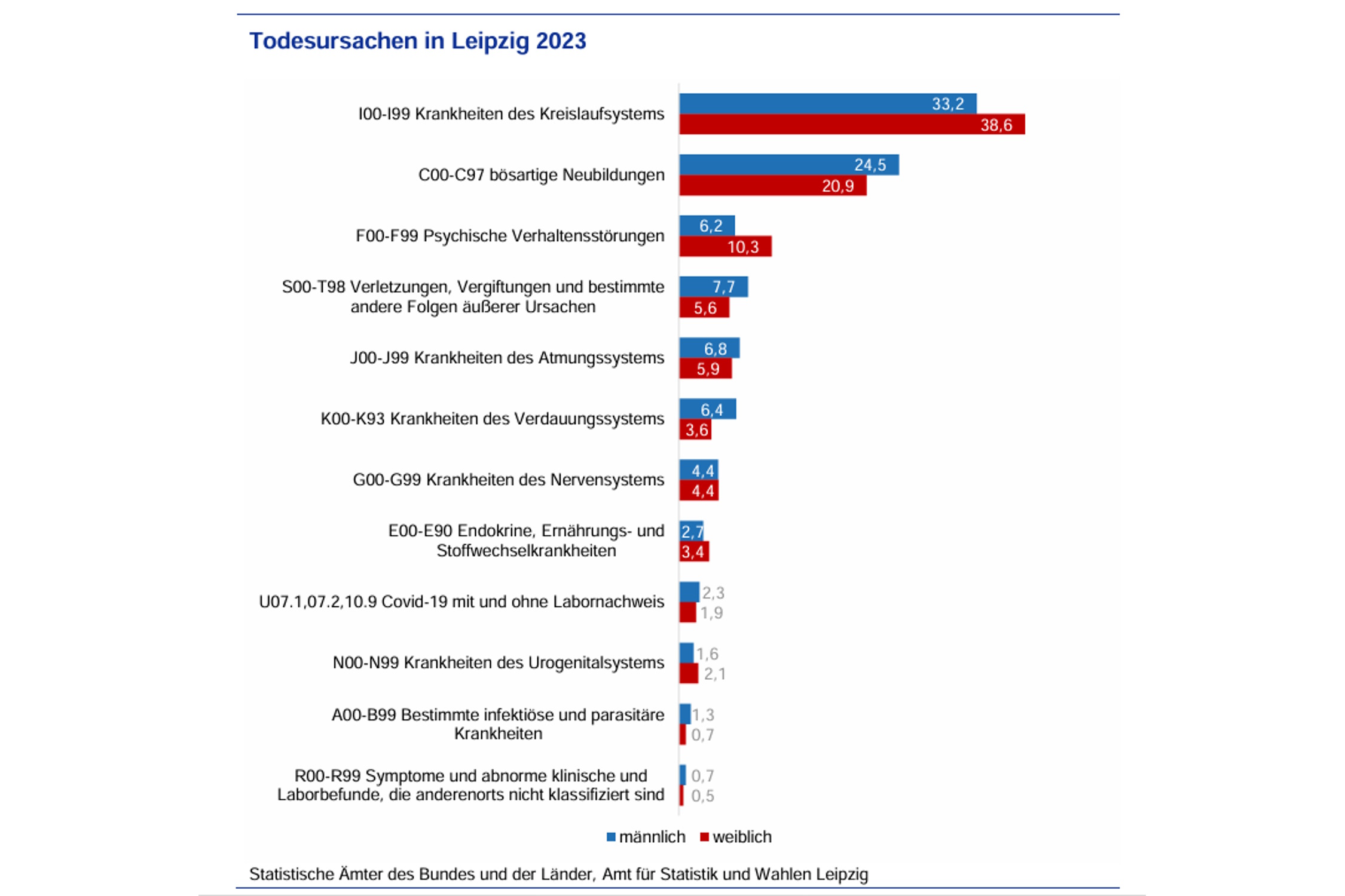 Auch in Leipzig waren Krankheiten des Kreislaufsystems mit einem Anteil von rund 36 Prozent (2023) die häufigste Todesursache. Besonders auffällig ist, dass Frauen mit knapp 38,6 Prozent stärker betroffen waren als Männer (33,2 Prozent). Damit liegt Leipzig leicht über dem Bundesdurchschnitt, wo der Anteil bei etwa 33,9 Prozent (2023) lag.“
