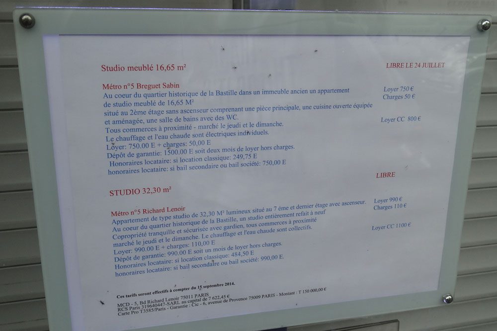 Wohnungsangebote, auf die wir während unserer Spaziergänge stießen, sind für uns Leipziger unvorstellbar hoch. Für Pariser ist das eher die Normalität.