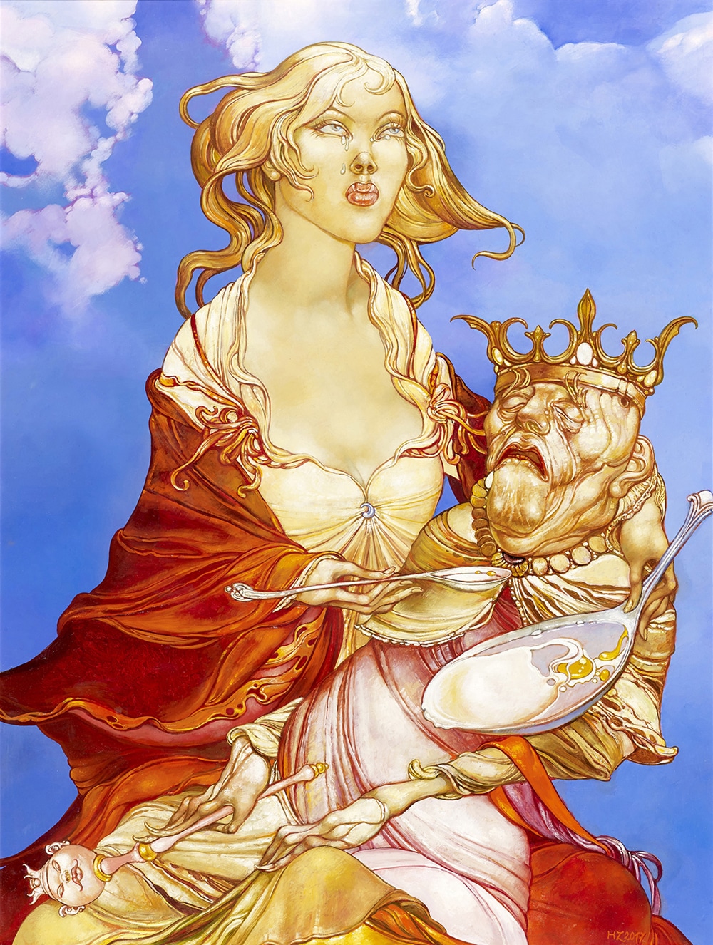 Heinz Zander: Der kranke König, liebevoll gefüttert mit Spiegelei, 2018, Öl auf Hartfaser. Foto: Heinz Zander