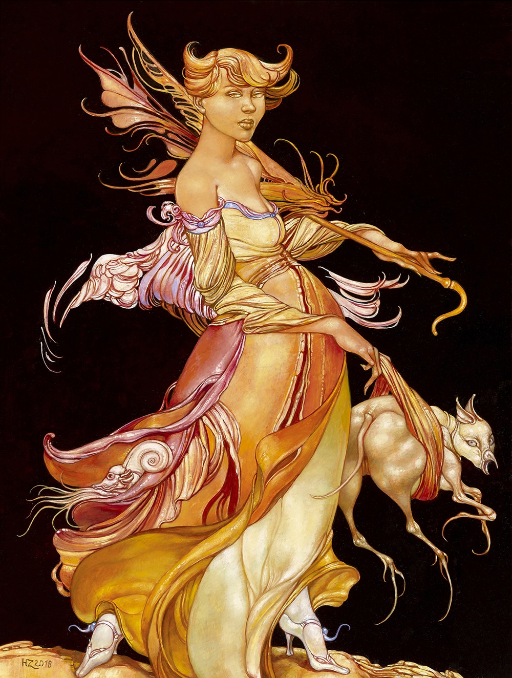 Heinz Zander: Schwangeres Sommerengelchen in einem duftigen Sommerkleidchen mit einem oft gebrauchten Sommersonnensonnenschirm, 2017, Öl auf Hartfaser. Foto: Heinz Zander