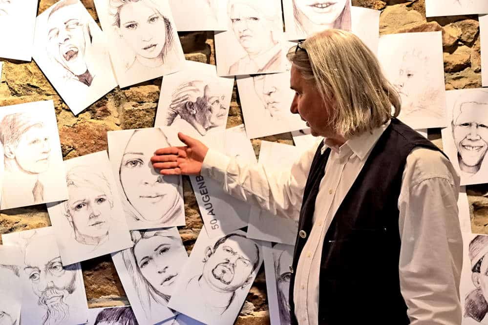 Fingerübungen nennt. Sie trägt den Titel „50 Augenblicke“ und zeigt Menschen, denen der Künstler nicht zwingend begegnet ist, die er irgendwo auf einem Bild gesehen und dann skizziert hat. Zwischen all den Porträts stechen gleich zwei ganz besonders hervor.