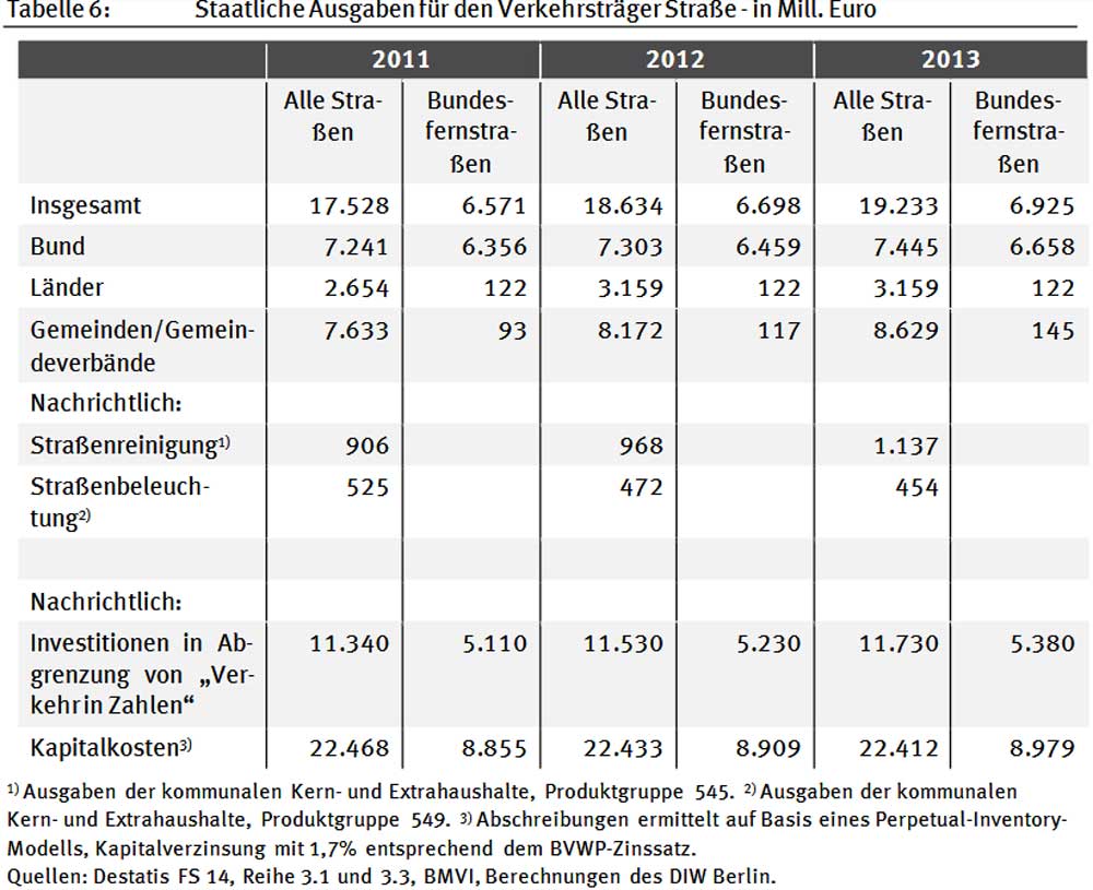 Aber das ist nicht annähernd in der Nähe der tatsächlichen Summen, die jedes Jahr für Straßenbau ausgegeben werden. Denn der Bund ist ja nicht der einzige Straßenbauer. Das hat sogar das Bundesministerium für Umwelt, Naturschutz, Bau und Reaktorsicherheit 2017 mal genauer ausgerechnet. „Insgesamt hat die öffentliche Hand im Jahre 2013 über 38 Mrd. Euro für die hier erfassten Verkehrsträger ausgegeben. Davon entfiel der quantitativ größte Ausgabenblock mit 19 Mrd. Euro auf die Straßen, gefolgt von knapp 9 Mrd. Euro für die DB und 3,6 Mrd. Euro für den ÖSPV“, kann man da lesen.