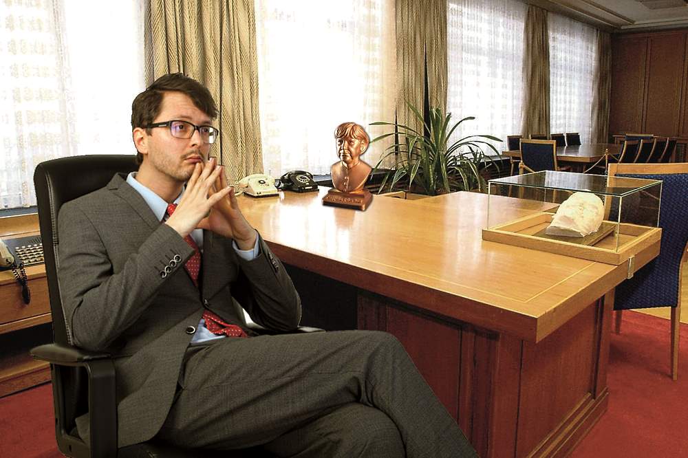 Die gesamte Redaktion steht knöcheltief in roter Soße, redet in Zungen, Leiber zucken wild, als wären sie von hundert Teufeln besessen. Auf einem Sockel steht eine Skulptur der Bundeskanzlerin, vor ihr kniet der Chefredakteur, seinen Kopf, der von einer Reptilienmaske verdeckt wird, arhythmisch in die Höhe reckend. Ich gehe zum Tresen, schenke mir ein Glas Adrenoschnaps ein und tausche an der Garderobe meine Klamotten gegen eine Mönchskutte.