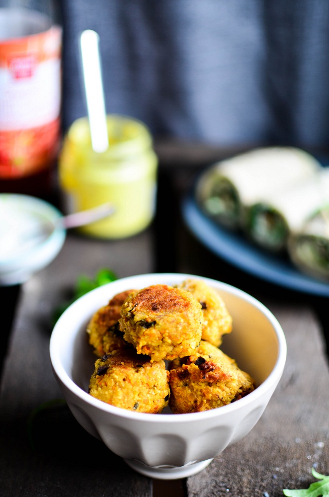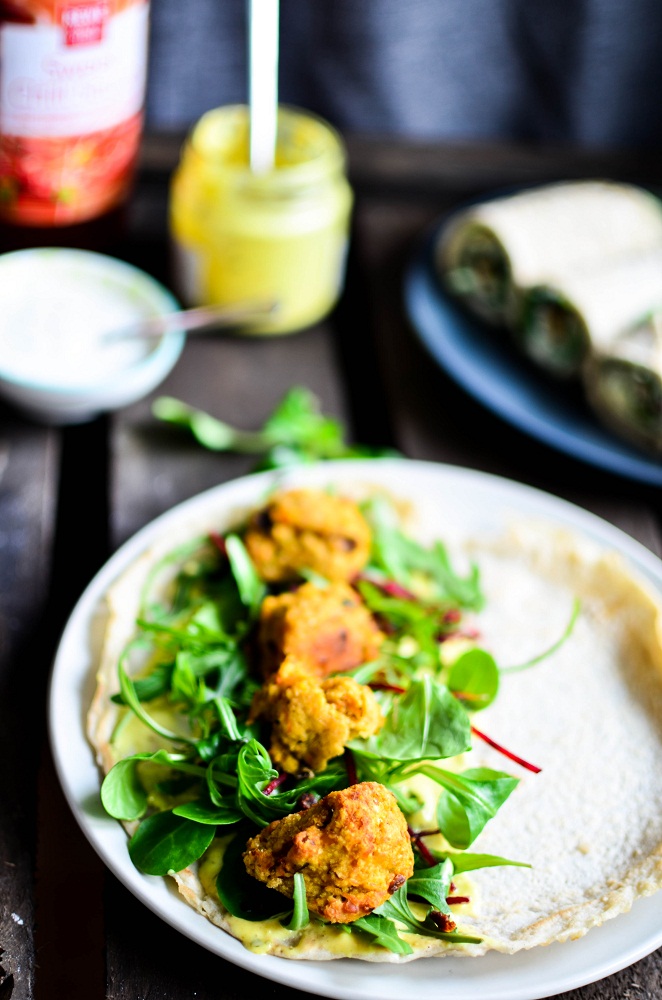 - Nun die Galette nach Gusto mit Aufstrich, Gemüse und den Linsenbällchen belegen, eng aufrollen und genießen.