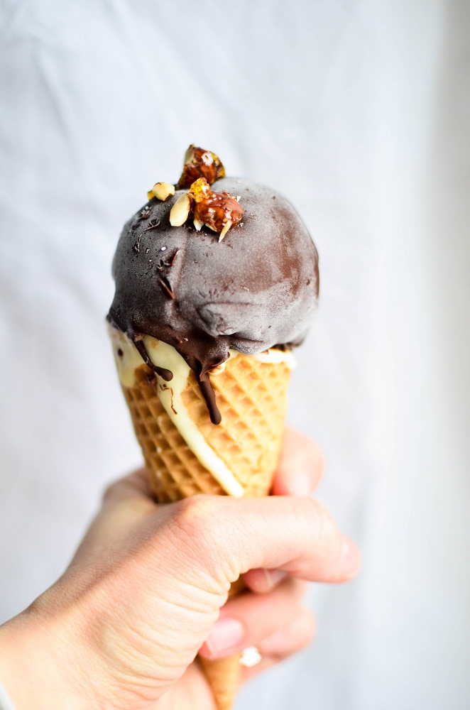 Was hier nun nach immens viel Arbeit klingt, ist eigentlich nur eine flinke Bastelarbeit. Zwar kann man das Eis auch selber frieren, den Knusper höchst persönlich zubereiten und die Sauce ganz allein zusammenrühren, aber wenn der Eishunger mal ganz groß ist, nimmt man einfach fertige Produkte guter Qualität und kombiniert sie zum persönlichen Lieblingseis. Und wenn das Wetter gerade nicht wirklich zum Schlecken von Gefrorenem einlädt, der bereitet es einfach schon mal in kluger Voraussicht zu, denn der Frühling wird kommen, ganz bestimmt!