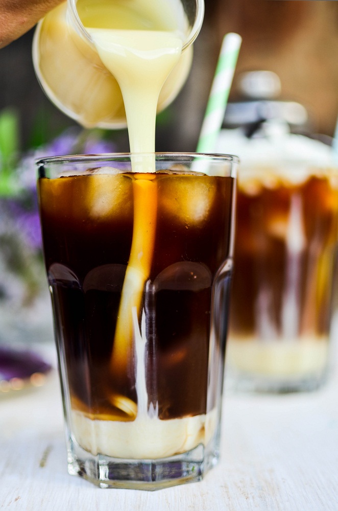 - Die Eiswürfel auf vier Gläser verteilen. Die Gläser nun zu etwa drei Vierteln mit dem kalten Kaffee befüllen und 4-6 Esslöffel gezuckerte Kondensmilch eingießen. Eventuell mit geschlagener Sahne und Schokoraspeln servieren. Eiskalt genießen.