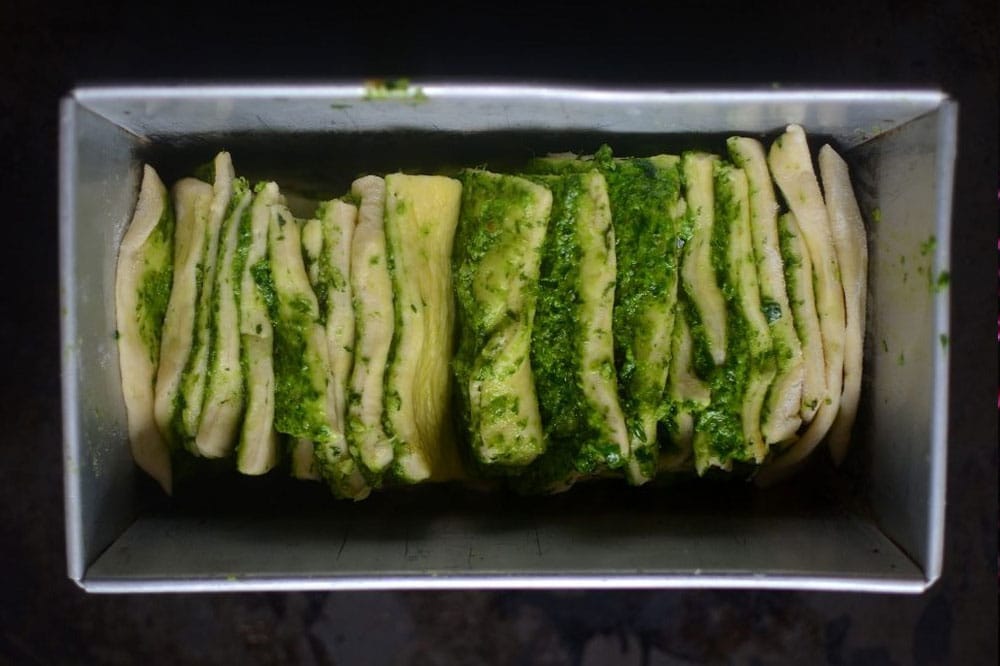 3. Eine kleine Kastenform leicht ölen. Den gegangenen Hefeteig noch einmal gut durchkneten, dann etwa 0,5 cm dick und rechteckig ausrollen. Nun den Teig großzügig mit Pesto bestreichen, wer mag, streut noch etwas Parmesan darüber. Nun den Teig in etwa 8 x 8 cm große Quadrate schneiden und diese übereinander legen, sodass ein kleiner Turm entsteht. Dieser wird dann waagerecht in die Kastenform gelegt. Wenn noch kleine Teigreste über sind, können die ohne Probleme zum Lückenfüllen benutzt werden. Das Brot nun etwa 15 Minuten gehen lassen und währenddessen den Ofen auf 200 °C Ober-/Unterhitze vorheizen.