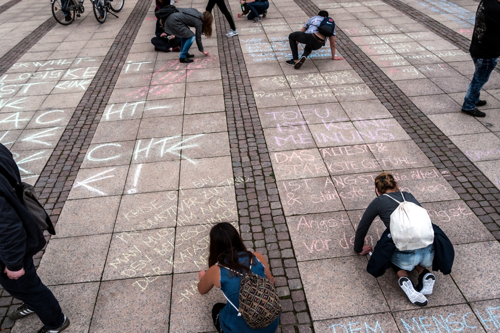 Gesagt, getan. Dutzende Demoteilnehmer griffen zu Straßenkreide und schrieben ausgesuchte Zitate von Schriftstellern und Schriftstellerinnen verschiedener Zeiten und Länder auf den Platz vor der Oper. Auf diese Weise entstand ein buntes Schriftbild mit unterhaltsamen, streitbaren oder nachdenklichen Äußerungen. Nachdem die Demonstration „Leipzig nimmt Platz“ zum Richard-Wagner-Platz weiterzog, wo zeitgleich eine rechte Kundgebung statt fand, schlenderten Passanten über den Augustusplatz, manche blieben stehen und lasen. Noch bis morgen Abend bleiben die Aphorismen auf dem Platz vor der Oper erhalten.