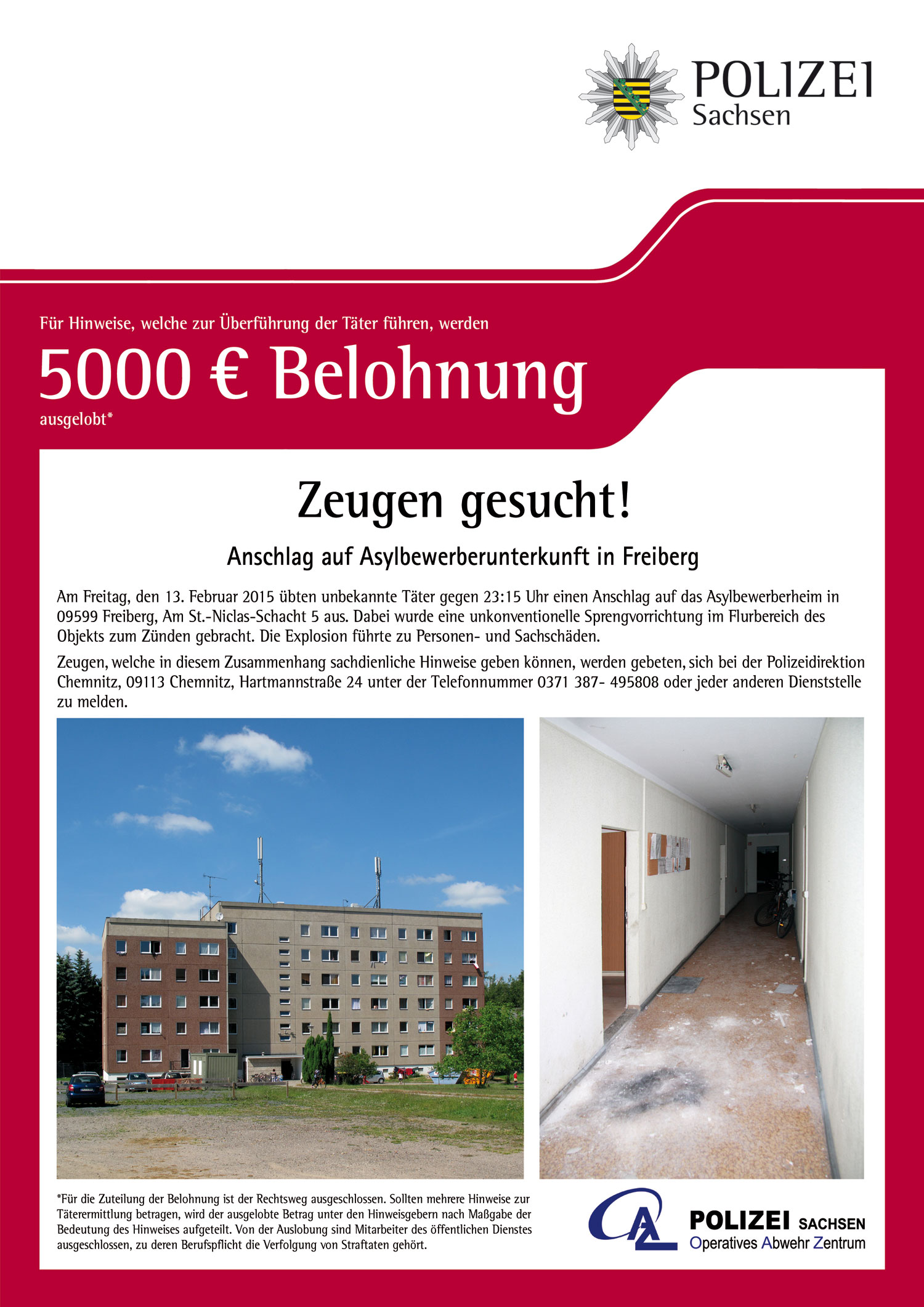 Am Freitag, den 13.02.2015 kam es zwischen 23:10 Uhr und 23:15 Uhr zu einem Angriff auf das Asylbewerberheim am St.-Niclas-Schacht in Freiberg. Hierbei brachten noch unbekannte Tatverdächtige eine Sprengvorrichtung in die Unterkunft ein, welche dort kurz darauf zur Umsetzung kam.