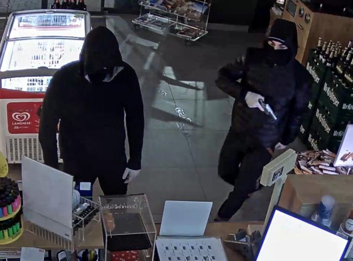 Beide unbekannte Täter führten augenscheinliche Pistolen mit sich, mit denen sie die Angestellten (m, 20 und w, 19) bedrohten. Während einer der mutmaßlichen Täter kein Wort äußerte, sprach der zweite in gebrochenem Deutsch zu den Tankstellenmitarbeitern.