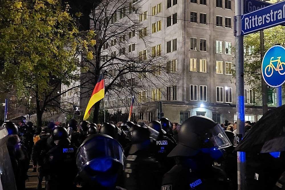 Vereinzelt wurden Einsatzkräfte mit Gegenständen beworfen und mit Reizstoff besprüht. In der Folge lief ein Großteil der Personen in die Grimmaische Straße und teilte sich in mehrere Gruppen. Den Einsatzkräften gelang es, diese zu stoppen. An mehreren Stellen wurden in der Folge wegen Verstößen gegen die Corona-Schutz-Verordnung und das Versammlungsgesetz zahlreiche Identitätsfeststellungen durchgeführt.