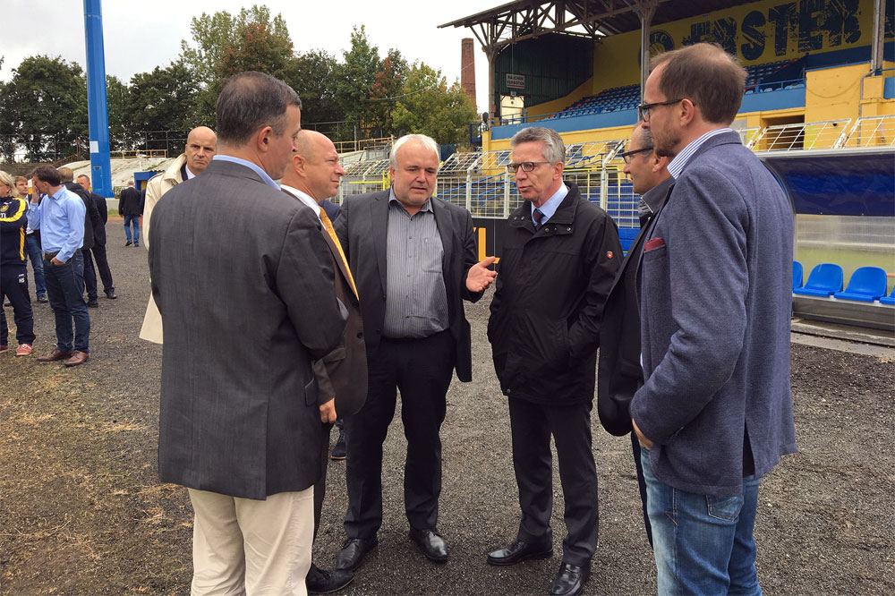 De Maizière sprach mit dem Präsidium, dem Aufsichtsrat, Cheftrainer Heiko Scholz sowie mit Nachwuchs-Trainern und -Spielern. Der Minister würdigte insbesondere den immensen Arbeitsaufwand der vielen ehrenamtlichen Helfer im Verein.