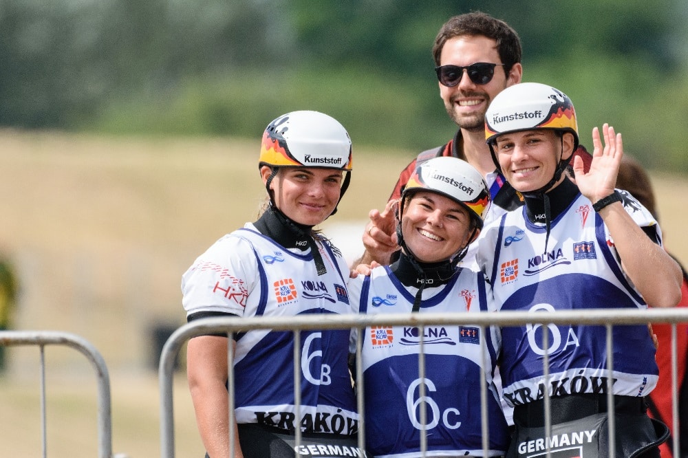 Gleich im Anschluss mussten die Kajak-Damen der U23-Altersklasse eine lange Zitterpartie aussitzen. Mit zwei Torstabberührungen leuchtete im Ziel der zweite Rang auf. Doch es folgten noch zwei weitere Mannschaften. Als sich die Tschechen noch vor die Deutschen setzten, mussten Anna Faber, Selina Jones und Stella Mehlhorn lange hoffen.