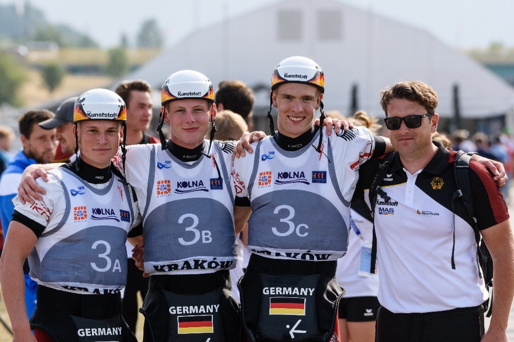 Die dritte Medaille des Tages fuhren die Kajak-Junioren nach Hause. Maximilian Dilli, Paul Bretzinger und Tillmann Röller mussten ebenfalls lang auf das finale Ergebnis warten und Bangen. Für sie bedeutete die identische Situation, wie zuvor auch bei den U23-Damen, eine lange Zeit der Ungewissheit.