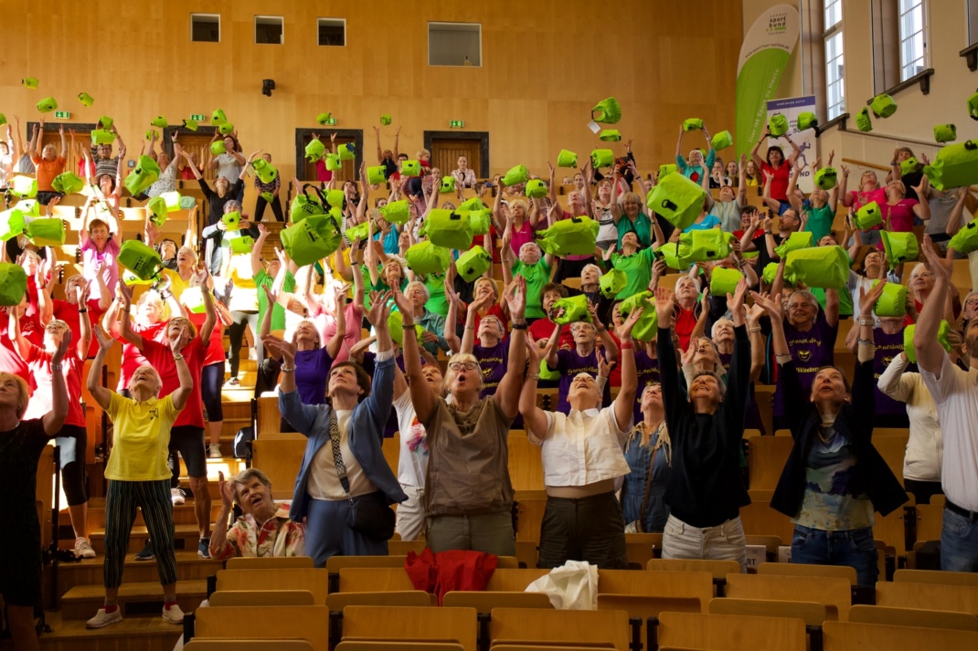 Alle Gäste und Workshop-Teilnehmende auf dem Campus begannen die Veranstaltung mit einer gemeinsamen Erwärmung im großen Hörsaal.