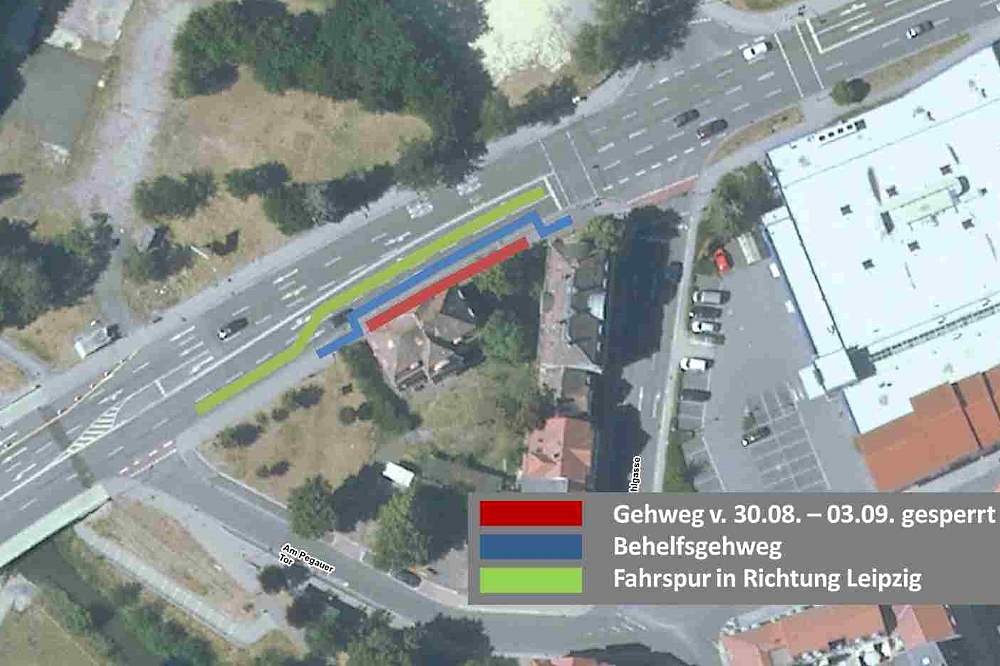 In der kommenden Woche steht in Fahrtrichtung Leipzig in der Sachsenallee zwischen der Straße „Am Pegauer Tor“ und der Mühlgasse nur eine Fahrspur zur Verfügung. Aufgrund von Tiefbauarbeiten im Bereich des Gehweges steht zwischen der Straße „Am Pegauer Tor“ und der Mühlgasse in Fahrtrichtung Leipzig ab 30. August nur eine Fahrspur zur Verfügung.